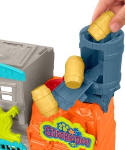 Is this old miner’s town really haunted by g-g-g-Ghosts?! Young super sleuths can help SCOOBY explore the multiple levels of the deserted mine, where hidden doors disguise a mine cart track and treacherous ghosts and rolling barrels lurk around corners. Can Scooby get to the bottom of this spooky mystery and unmask the old miner? Watch out, SCOOBY! Kids can join their favorite four-legged sleuth as he tries to uncover the truth about this haunted old town—and help him avoid the hidden traps. A turn of a Power Pad reveals a trap door; another turn reveals a projectile launcher! There’s a secret mine entrance, a cart platform and track, a trick ladder, and rolling barrels, too. Even if Scooby makes it past all of that, there’s still a spooky old miner on the loose! Ru-roh! Includes SCOOBY, Miner with removable helmet & accessory, 3 coin projectiles & mine cart with launcher. Lock up the villain. Remove the Miner’s helmet to discover his real identity! Send SCOOBY zooming down the track. Watch out for barrels! Turn the top Power Pad one way to reveal a projectile launcher. Flick to fire!