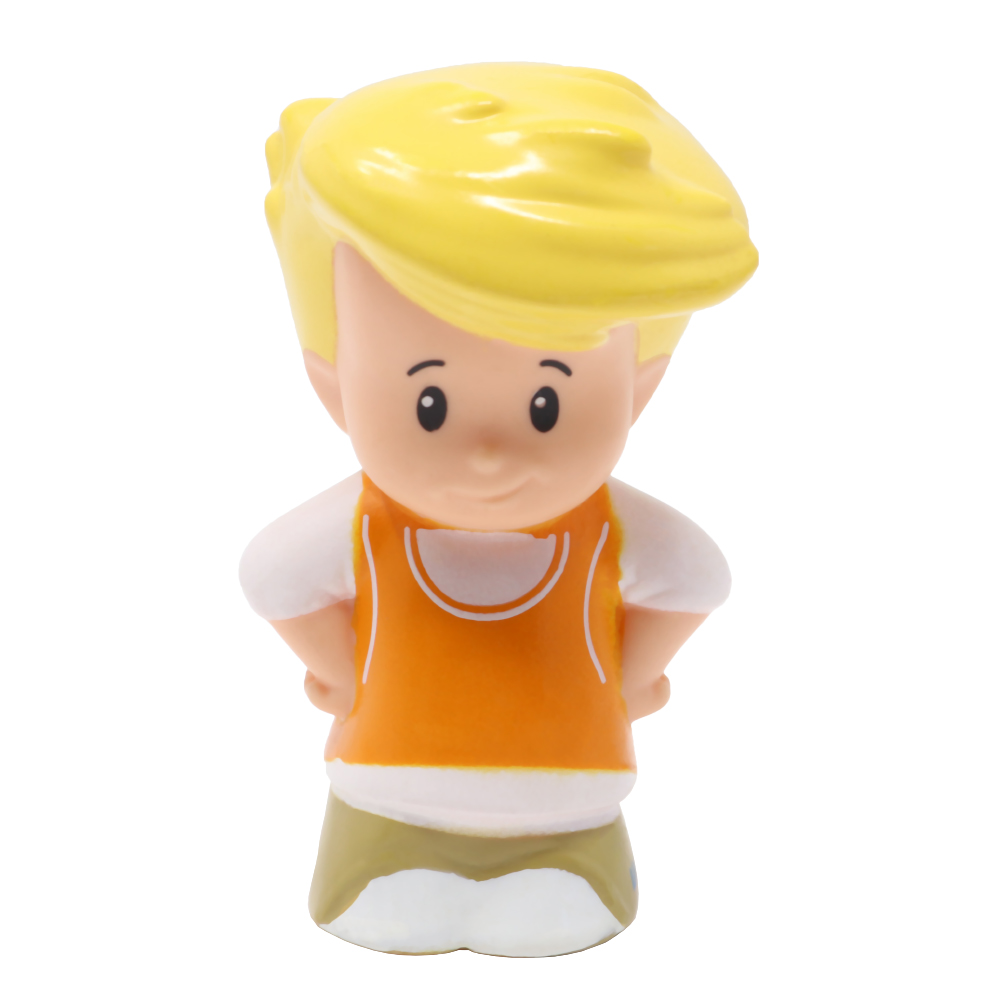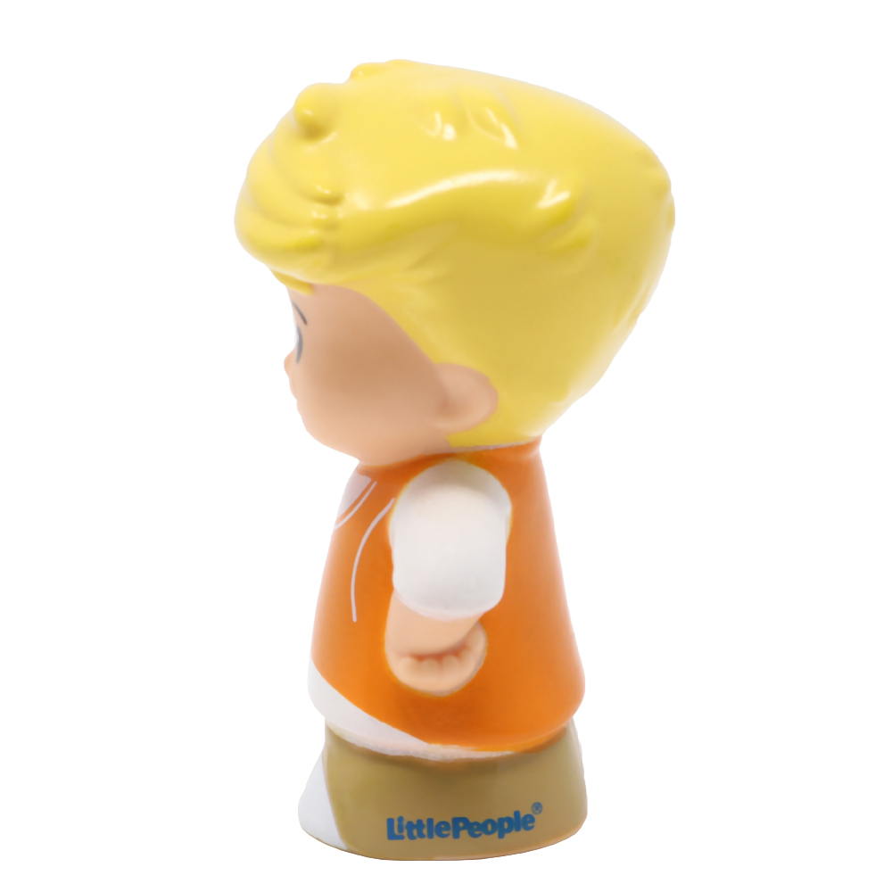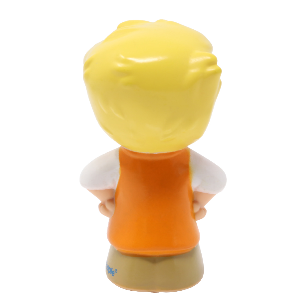 This listing is for a replacement Eddie figure from the Collectible Fisher-Price Little People Lil’ Movers Airplane Playset (BLR84). The figure features the little boy character Eddie wearing an orange vest, white shirt, and tan pants. He has blonde hair.