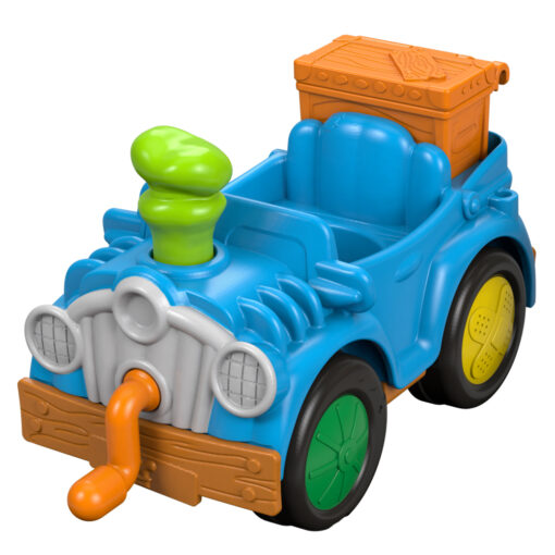 No need for a tune-up, Goofy’s ready to cruise around the Little People world with this pint-sized jalopy! Watch as the smoke stack pops up and down as the jalopy rolls and wobbles about town. And, flip open the tool box to see who’s hiding inside! Where development comes into play, Fine and gross motor: Grasping and moving Goofy and his jalopy helps little ones build dexterity and gross motor skills.